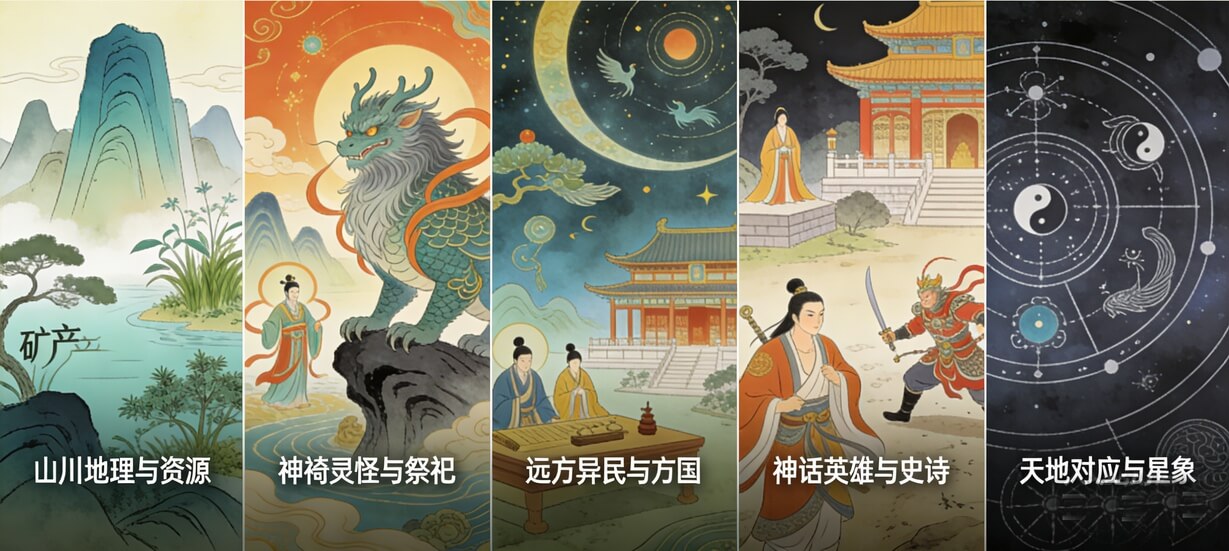 《山海经》为读者呈现的是一幅由地理、神怪、异人、星象交织而成的宏大画卷。按类别可以梳理出以下五大图景: