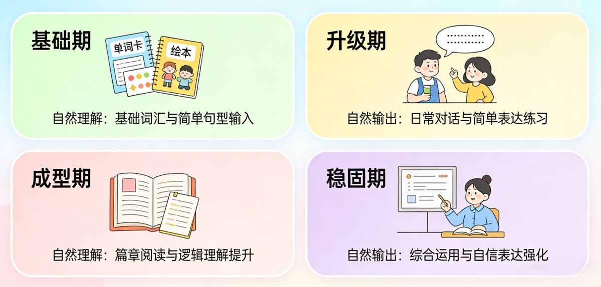 这份英语成长路线图的核心,在于遵循语言习得的自然规律——它如同一张层层解锁的地图,每一步扎实积累都为下一阶段铺路,最终让英语自然融入生活,成为孩子探索世界的工具。