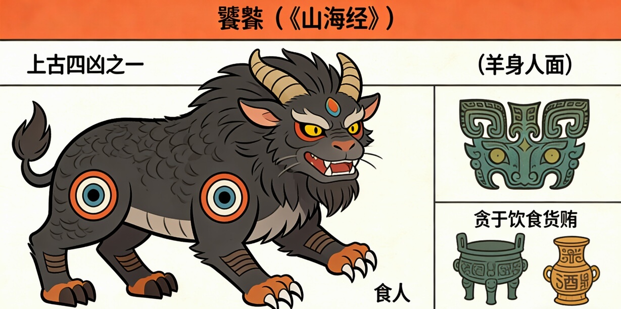 饕餮在《山海经》原著中并不直接叫“饕餮”,而是以“狍鸮”(páo xiāo)之名出现,记载于《北山经》的“钩吾山”一条。